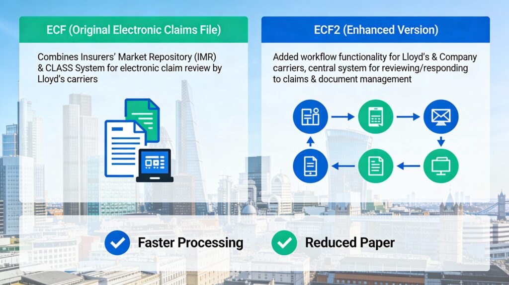 At the foundation of Electronic Claims File (ECF2) in the London Market is a two-layer architecture. ECF is the core electronic claims environment that combines IMR and CLASS. ECF2 is the enhanced modern generation that Lloyd’s and company-market carriers use across the London Market for streamlined claims management. Understanding how these components fit together within the Electronic Claims File (ECF2) ecosystem is the critical first step.